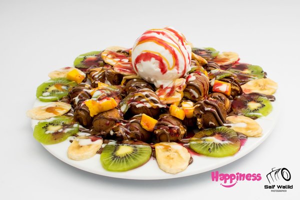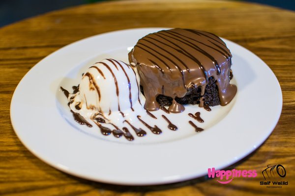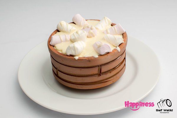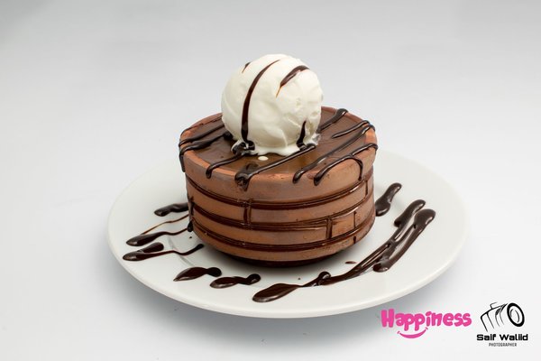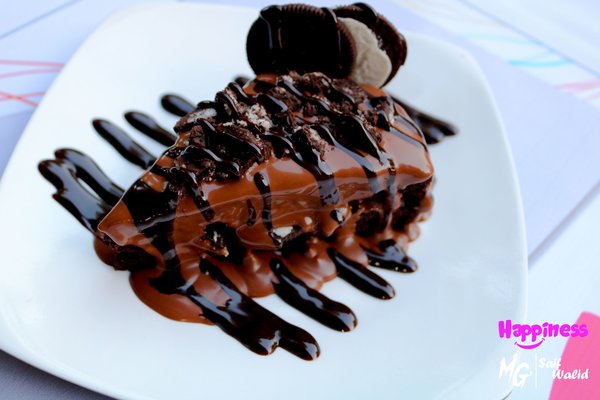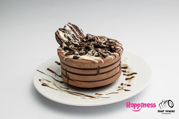 Layer of Happiness chocolate cake covered with whipped cream covered with white chocolate and served with your choice ice cream , oreo, marshmallow, lotus, kitkat, fruits or nuts