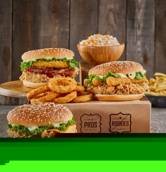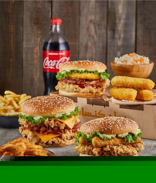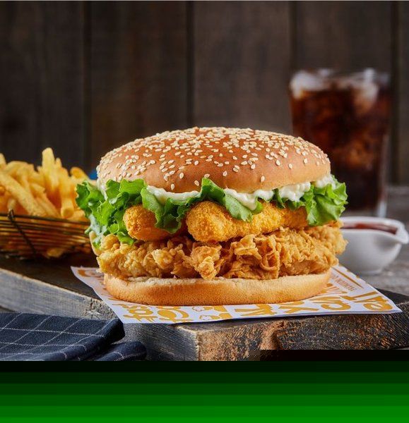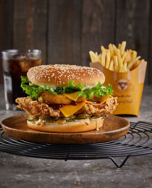 Chicken breasts, hash brown, 2 cheese, pickles, BBQ sauce, South sauce, pepper sauce and bread with sesame