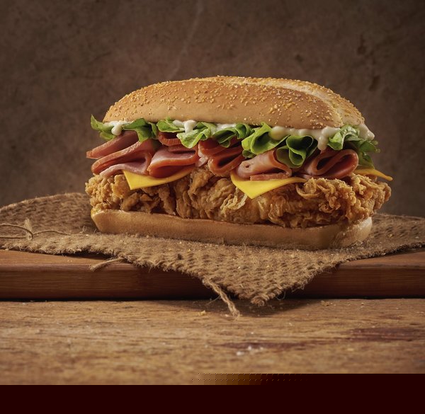 Chicken breast, fried mozzarella, beef bacon, lettuce, tomato sauce, mayonnaise, bread with sesame