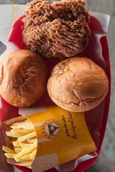 2 large chicken pieces, 1 small chicken piece with special marination, rice, bread, 2 slices of crispy chicken