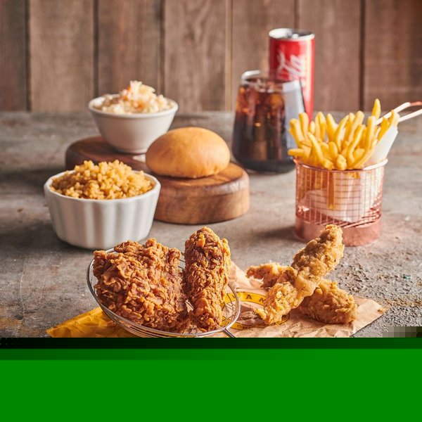 3 large pieces, 2 small pieces, 5 chicken strips pieces, 3 kansas wraps, 2 junior fillet sandwiches, family French fries, 5 bread, large coleslaw salad and family drink