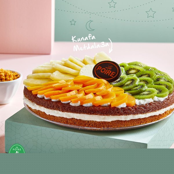 La Poire konafa with baladi samna covered with mango cream garnished with mango pieces