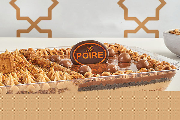 Layer of crispy biscuits, nutella, cream stuffed with walnuts, La Poire konafa othmanlya, maltesers, caramelized toffee