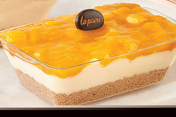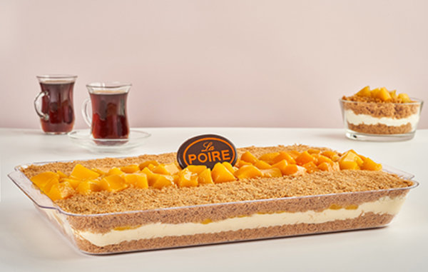 Layer of La Poire konafa, 1/2 lotus cream with lotus biscuits, 1/2 mango with mango cream and mango pieces