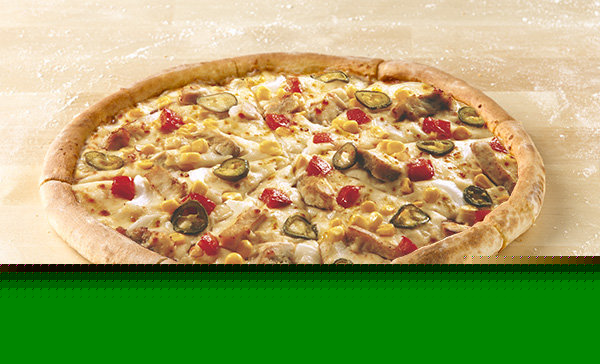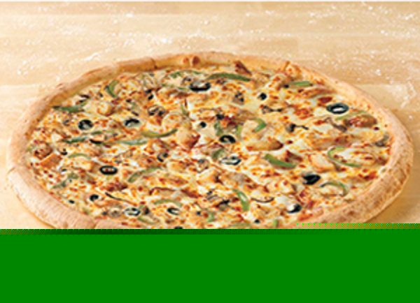 Grilled chicken, chicken sausage, chicken pepperoni, fresh mushroom, onion, green pepper and black olives