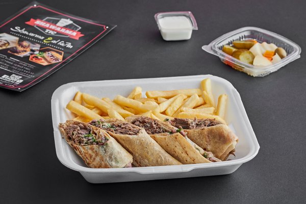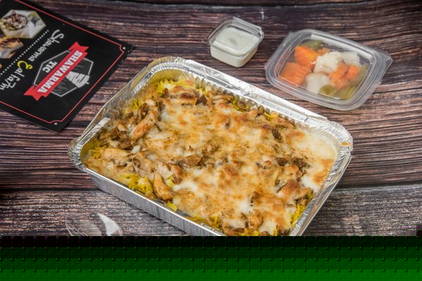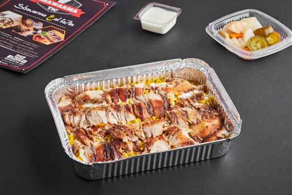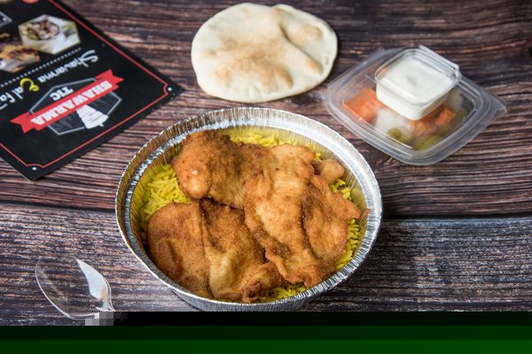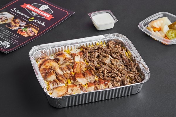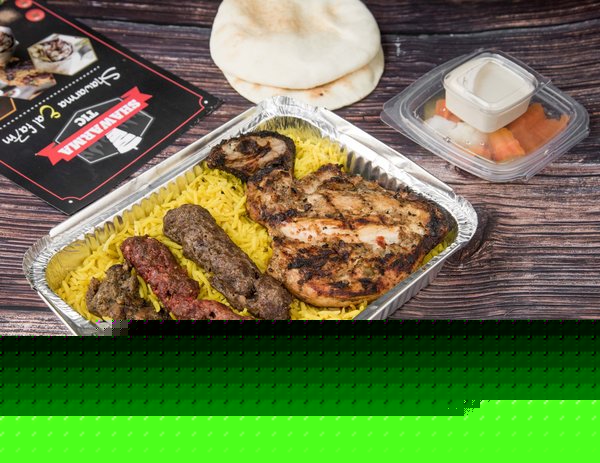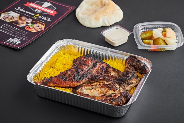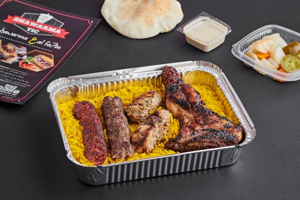 Each meal includes 1/4 chicken, 2 shish tawook pieces, 1 kofta, 1 sojouk, rice, tehina, garlic dip , bread and pickles