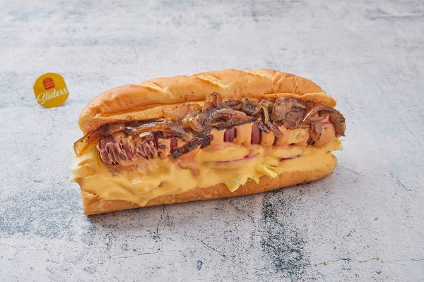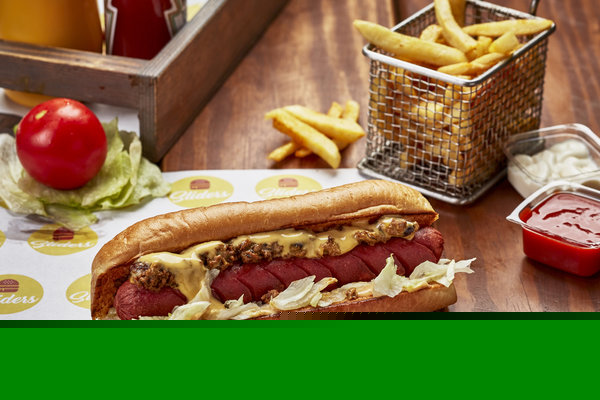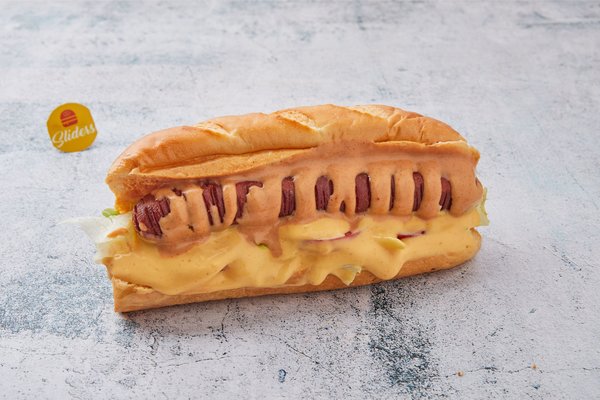 Good old hot dog covered with melting cheese, lettuce and our special house sauce