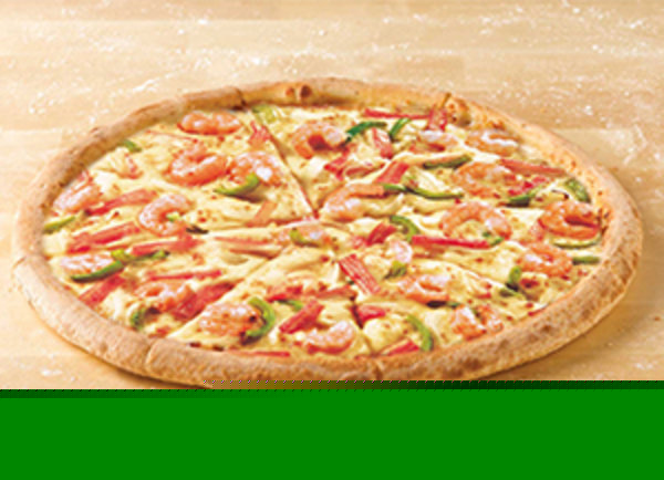 Shrimp, calamari, green pepper and onion with pizza sauce