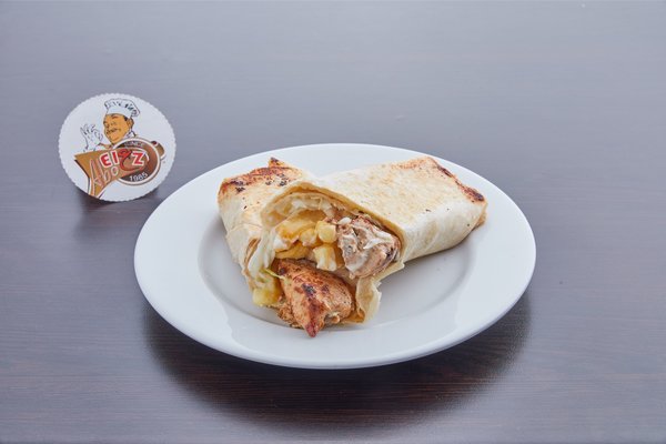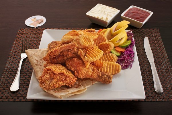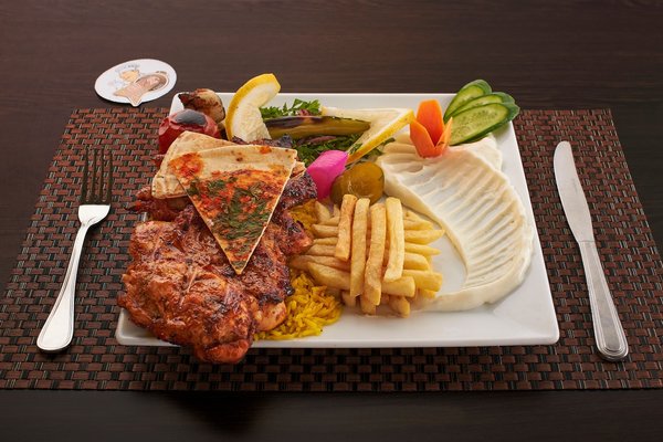 1/2 boneless chicken with basmati rice, fries, garlic dip, pickles and bread
