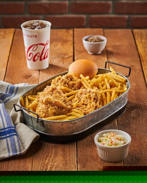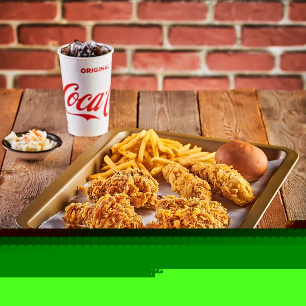 Chicken pieces, family fries, large coleslaw, liter coca-cola, bread