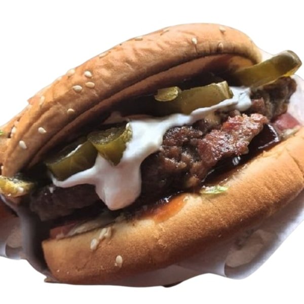 2 beef burger patties, mayonnaise sauce, cheddar sauce