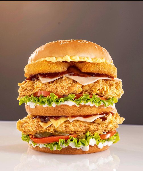 Crispy chicken breasts, smoked turkey, American cheese slices, cheddar sauce, BBQ sauce, lettuce, tomato, pickled cucumber and creamy mayonnaise sauce