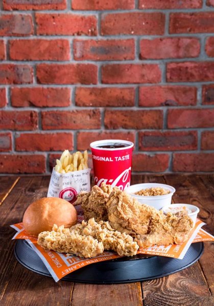 3 fried chicken pieces, 2 chicken strips, rce, fries, coleslaw, bread and drink