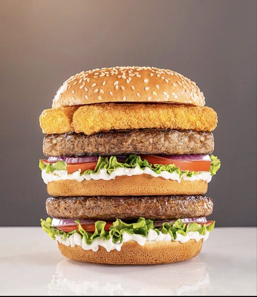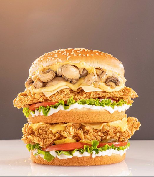 Crispy chicken breasts, mushroom sauce, American cheese slices, cheddar sauce, lettuce, tomato, pickled cucumber and creamy mayonnaise sauce