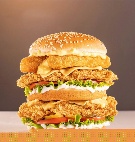 Crispy chicken breasts, cheddar cheese sticks, American cheese slices, cheddar sauce, lettuce, tomato, pickled cucumber and creamy mayonnaise sauce