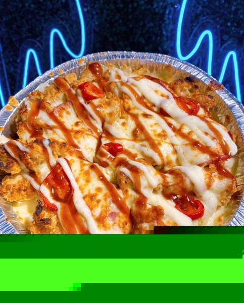 Crispy chicken breasts, mozzarella cheese, beef salami, pizza sauce, ranch sauce and BBQ sauce