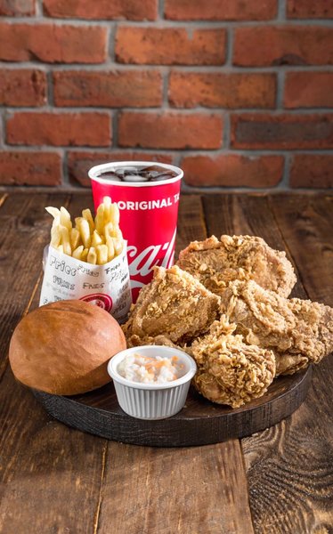 Fried chicken pieces with Chicken Planet special spices, large fries, large coleslaw salad, bread and soft drink liter