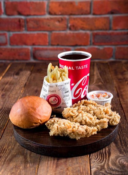 2 crispy chicken pieces with fries, bread, lettuce, coleslaw and coca cola