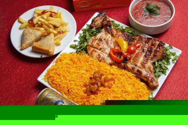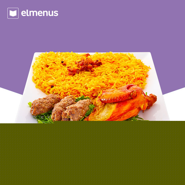 1/4 grilled chicken breasts, 1/8 kofta, served with biryani rice, green salad sahawiq sauce and bread