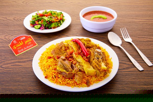 1/4 mandi chicken and 1/8 kofta, served with kabsa rice, green salad, sahawiq sauce and bread