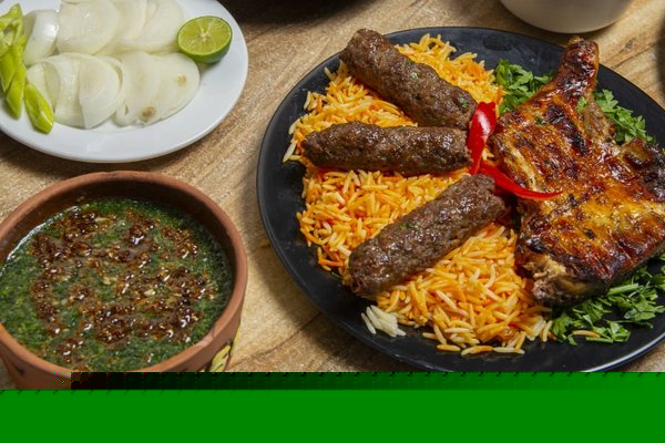 3 kebab pieces, 3 kofta, 1/4 chicken shish , served with basmati rice, green salad, sahawiq sauce and bread