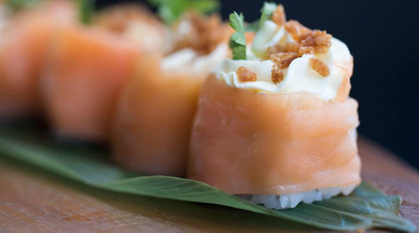Shrimp tempura, sushi rice, Philadelphia cheese, black sesame & salmon, served with sweet chill sauce