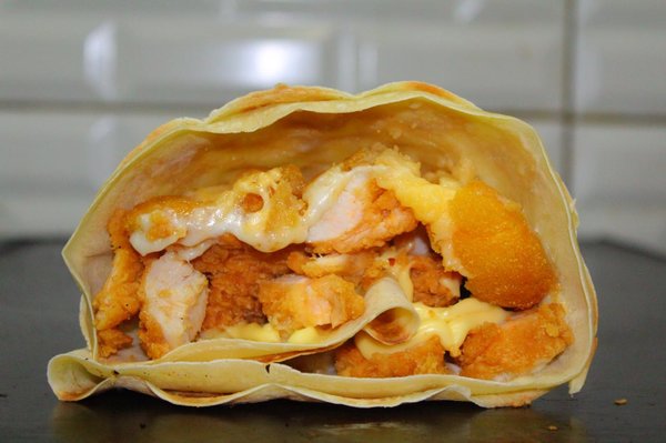 Spicy bread, mix cheese (mozzarella, gouda, cheddar), grilled chicken breasts, spicy fried chicken breasts, pickled cucumber, lettuce and ranch sauce