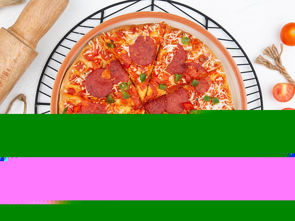 Salami, basil, cherry tomatoes, tomato sauce and mozzarella cheese