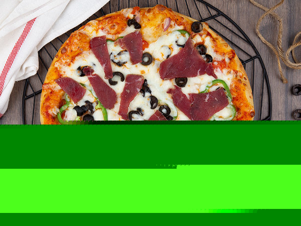 Oriental sojouk, tomato sauce , mozzarella cheese, green pepper, olives and parmesan Cheese
