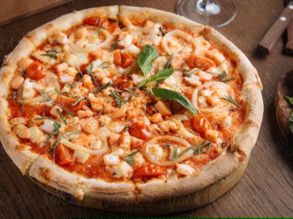 Shrimp, calamari, capers, basil, tomato sauce and mozzarella cheese