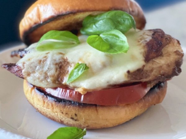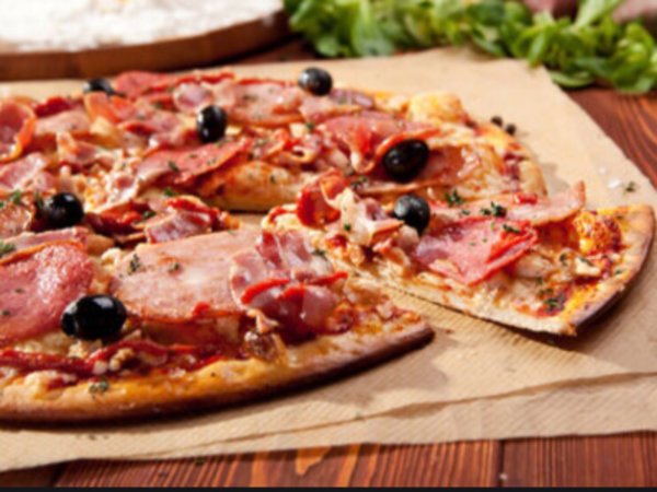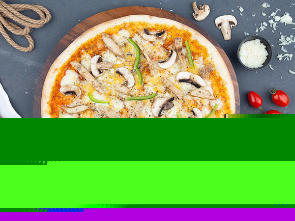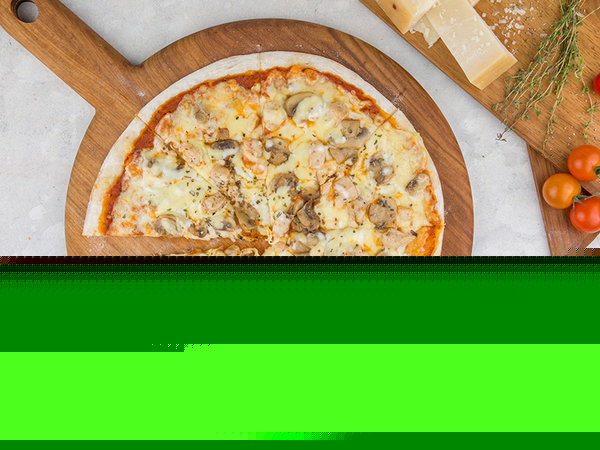 Beef bacon, mushrooms, basil, tomato sauce and mozzarella cheese