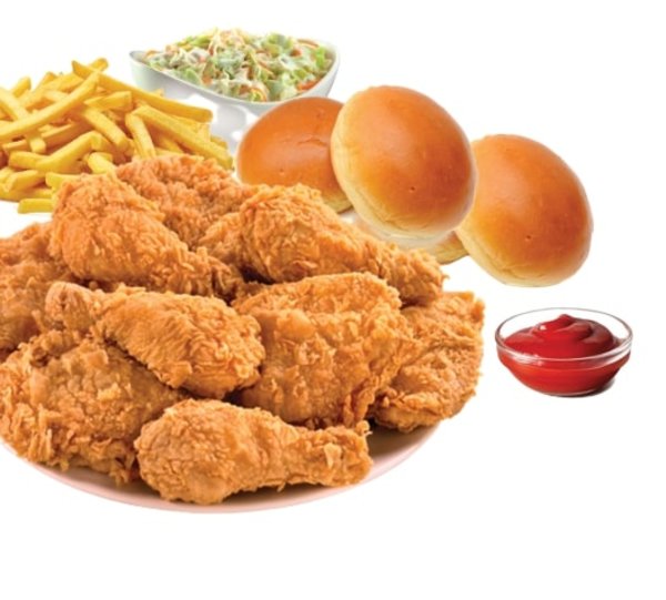 8 broasted pieces, 8 strips pieces, 4 fries packet, 3 cheddar sauce, 4 coleslaw, 1 liter pepsi and 4 bread pieces