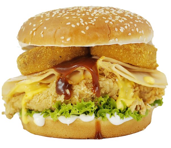 Chicken breasts, onion rings, BBQ sauce, cheese, turkey, lettuce, mayonnaise and bread with sesame