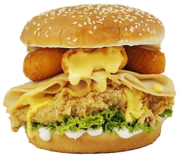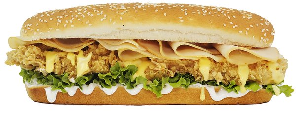 Chicken breasts, cheddar bites, cheddar sauce, cheese, turkey, lettuce, mayonnaise and bread with sesame