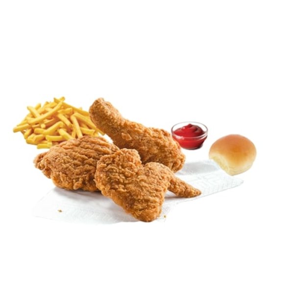 3 chicken pieces served with fries, bread and ketchup