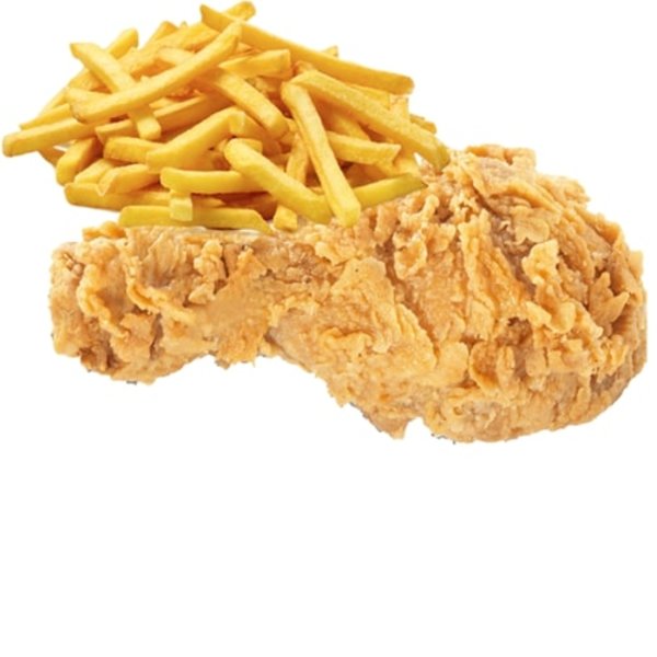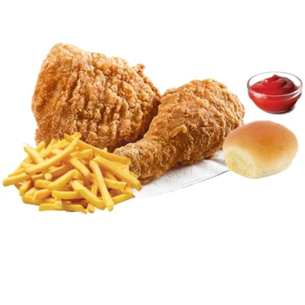 2 chicken pieces served with fries, bread and ketchup