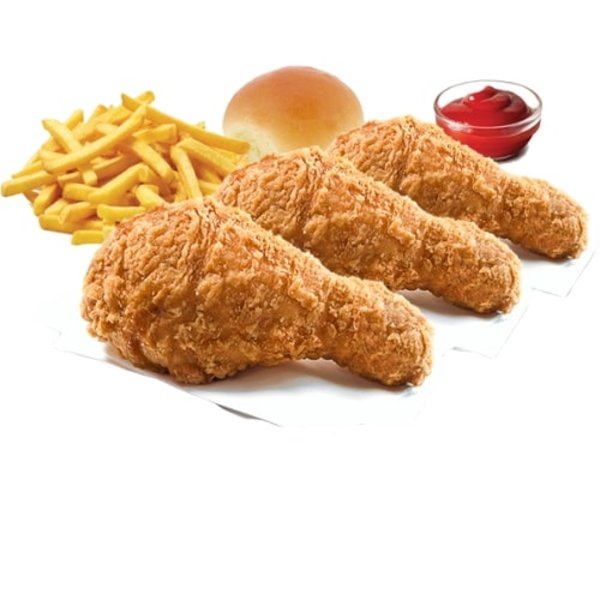 3 drumsticks pieces served with fries, bread and ketchup