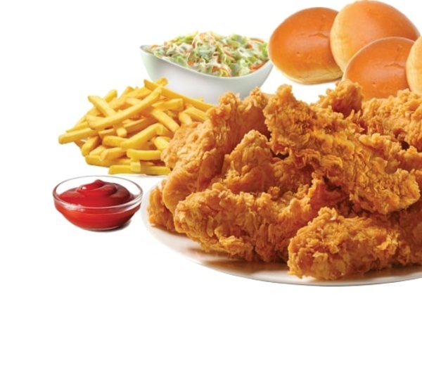 4 broasted pieces, 4 strips pieces, 2 fries packet, 1 cheddar sauce, 2 coleslaw, 1 liter pepsi and 2 bread pieces