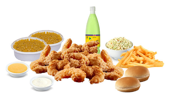 25 shrimp pieces, fries, 3 rice, 3 sauces of your choice, kaiser, coleslaw and family schweppes lemon mint