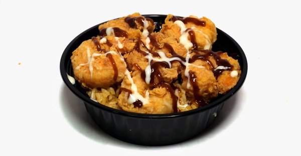 Vegas rice, 5 shrimp pieces, BBQ sauce and ranch sauce
