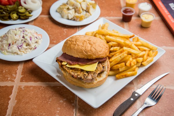 Enjoy the breast burger patty and Wild chicken cubes, grilled onions, fresh mushroom and bell pepper on top