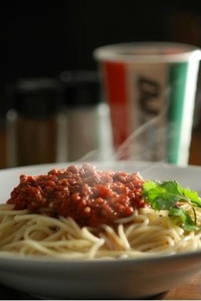 Spaghetti, romano cheese, ground beef, tomatoes sauce