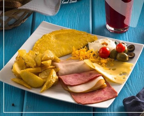 Omelette, mix cheese, smoked beef, smoked turkey, potato wedges