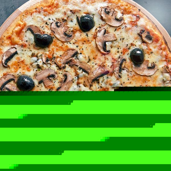 Mozzarella, tomato sauce, oregano, fresh mushrooms and olives