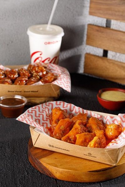 Original burger, smokey burger, shrooms burger, 8 wings pieces with dip of your choice and coca cola liter