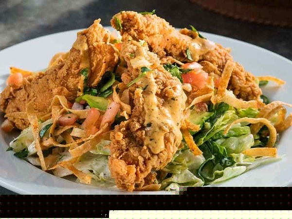 Crispy chicken slices, tortilla crunchy, lettuce, salad, pico de gallo salad, vinaigrette sauce
