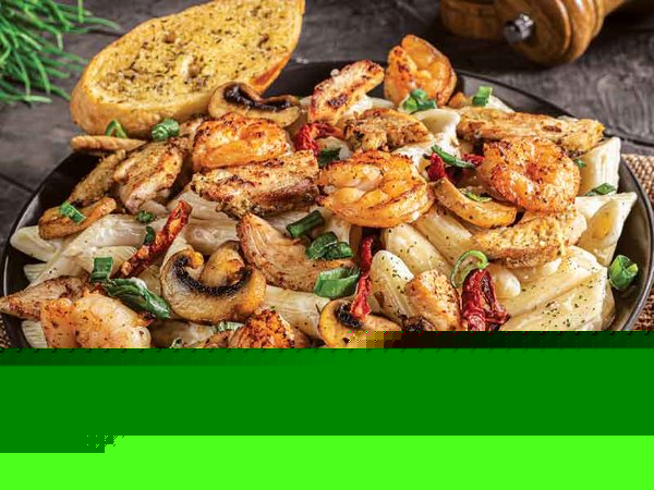 Penne pasta with chicken, shrimp and creamy lemon sauce with a mixture of dried tomatoes, mushrooms, green onions, cheese