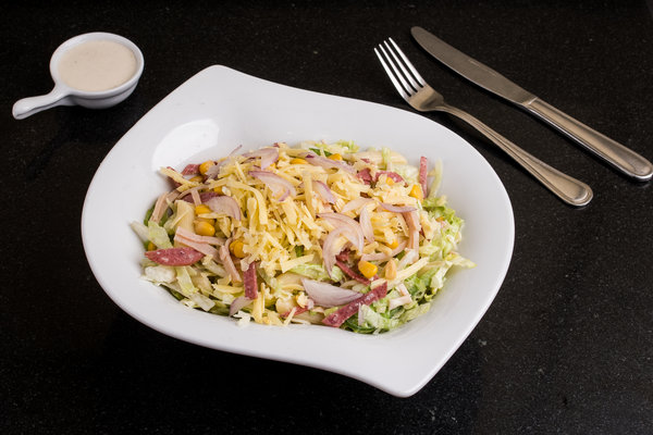 Pepperoni, turkey slices, cheddar cheese, lettuce, green pepper, onion & sweet corn, served with our caesar dressing