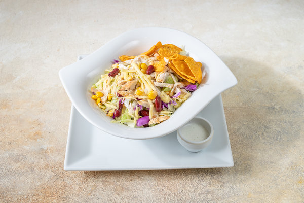 Grilled chicken, doritos, kidney beans, radishes, sweet corn, cheddar, cabbage, lettuce, blue cheese dressing