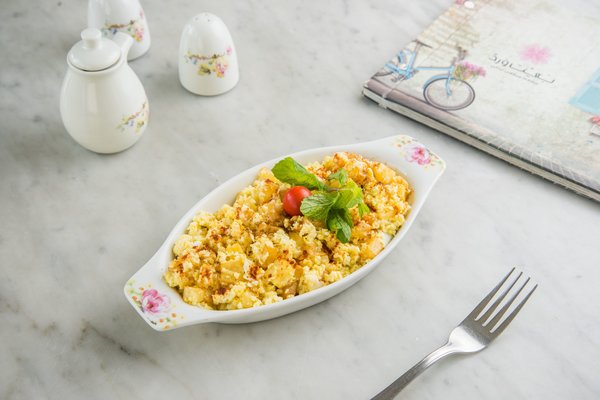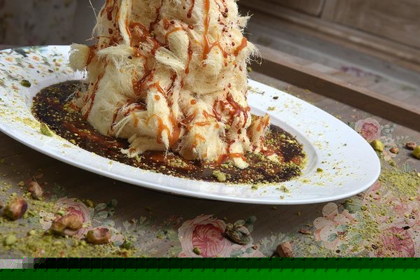 Mastic ice cream served with halawa shaa'r, caramel, gallab, honey and pistachio dressing